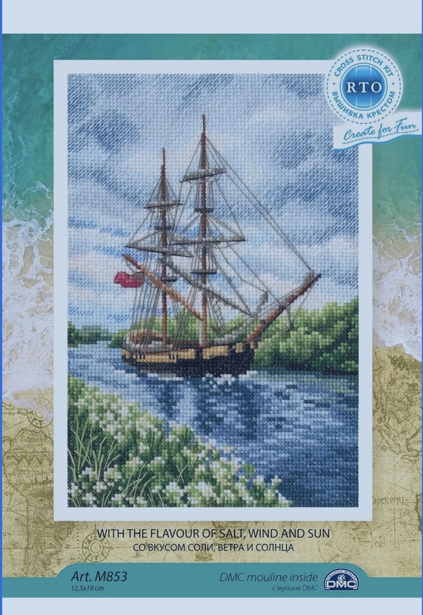 Набор вышивался исключительно на работе (я хозяйка, могу вышивать, могу халву есть). Покупала и вышивала на желание (сбылось)). Кто не знает про вышивку на желание? Наверное кто не вышивает). Насколько это работает - кто ж его знает). Главное верить и хотя бы немножко ползти в сторону оного желания, а лучше бежать)). Тогда все получится. Вышивался набор довольно долго, несмотря на свои скромные размеры - шила по бумажной схеме (сагу на него не нашла, а сама я перенаборы делать не умею и не хочу - я хочу вышивать)). Схемы РТО - квест еще тот. Символьные значки, схема черно-белая. Полукрест выделен розовым фоном. Все, что на белом - крест в два сложения. Мулине в наборе DMC, канва по ощущениям тоже DMC ( вот насколько чудесные нитки у них, настолько дер…вая не чудесная канва). Очень такая средненькая по качеству, что не добавляло скорости и энтузиазма. Каунт 14. Вышивала, бросала, снова брала. Развлекалась так примерно полгода, по чуть-чуть, но кораблик рос. После стирки сильно села