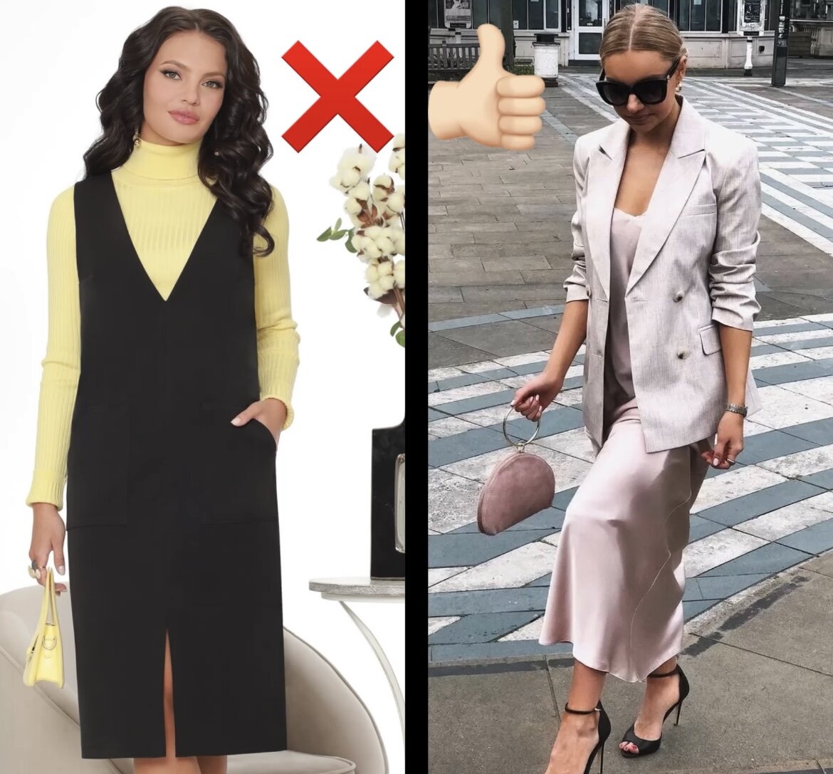 Скажу сразу, что по отдельности вещи, о которых пойдет речь, смотрятся хорошо, но стоит только неправильно их совместить и все - образ испорчен. Чтобы больше не допускать впредь таких ошибок, мы разберем самые частовстречаемые сочетания, которые выглядят просто ужасно. 5 несочетаемых вещей, которые многие носят от незнания Платье с водолазкой или футболкой Такое сочетание является максимально неудачным, так как оно в значительной степени искажает фигуру и создает эффект неуместности. Мало того, что водолазка будет выделять руки, так еще и к животику внимание привлечем, если он у вас имеется. Еще пару лет назад - это сочетание было трендом, но он также быстро прошел, как и начался. Сегодня же, на смену водолазкам и футболкам пришел пиджак, который смотрится намного элегантнее и стильнее. Есть одно сочетание, которое смотрится стильно и актуально! Это платье на бретельках со свитером. Важность заключается в том, что оно должно надеваться поверх платья. Тогда образ будет максимально нежны