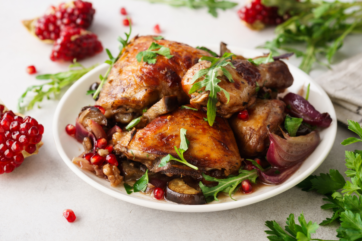 Курица, запечённая в гранатовом соусе, представляет собой блюдо с богатым, сладко-кислым вкусом и ярким ароматом. Гранатовый соус добавляет не только уникальный вкус, но и делает блюдо визуально привлекательным благодаря своему красивому рубиновому цвету. Время приготовления: около 1 часа Сложность: средняя Ингредиенты: Приготовление: Секреты приготовления Это блюдо сочетает в себе сладость и кислотность гранатового соуса с нежным вкусом курицы, делая его идеальным выбором для торжественного обеда или ужина. Полезные качества граната Гранат считается одним из самых полезных плодов, богатых антиоксидантами и другими питательными веществами, которые способствуют здоровью на различных уровнях: Интересные факты о гранате Гранат — это не только вкусный и освежающий плод, но и мощный источник питательных веществ, которые могут оказать значительное положительное воздействие на ваше здоровье. Приятного аппетита!