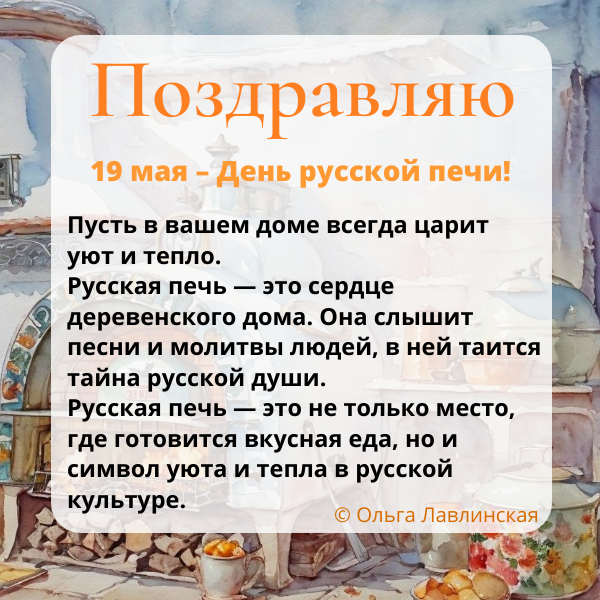 Пусть в вашем доме всегда царит уют и тепло. Русская печь — это сердце деревенского дома. Она слышит песни и молитвы людей, в ней таится тайна русской души. Русская печь — это не только место, где готовится вкусная еда, но и символ уюта и тепла в русской культуре. © Ольга Лавлинская