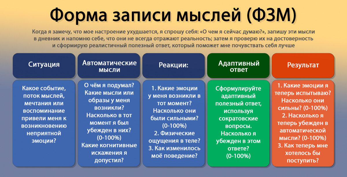 На одной из таких техник я сегодня хочу подробнее остановиться. Предлагаю вашему вниманию форму записи автоматических мыслей (ФЗМ). Это инструмент в когнитивно-поведенческой психотерапии, который представляет собой эффективный способ реагирования на автоматические мысли Такая форма состоит из пяти колонок.