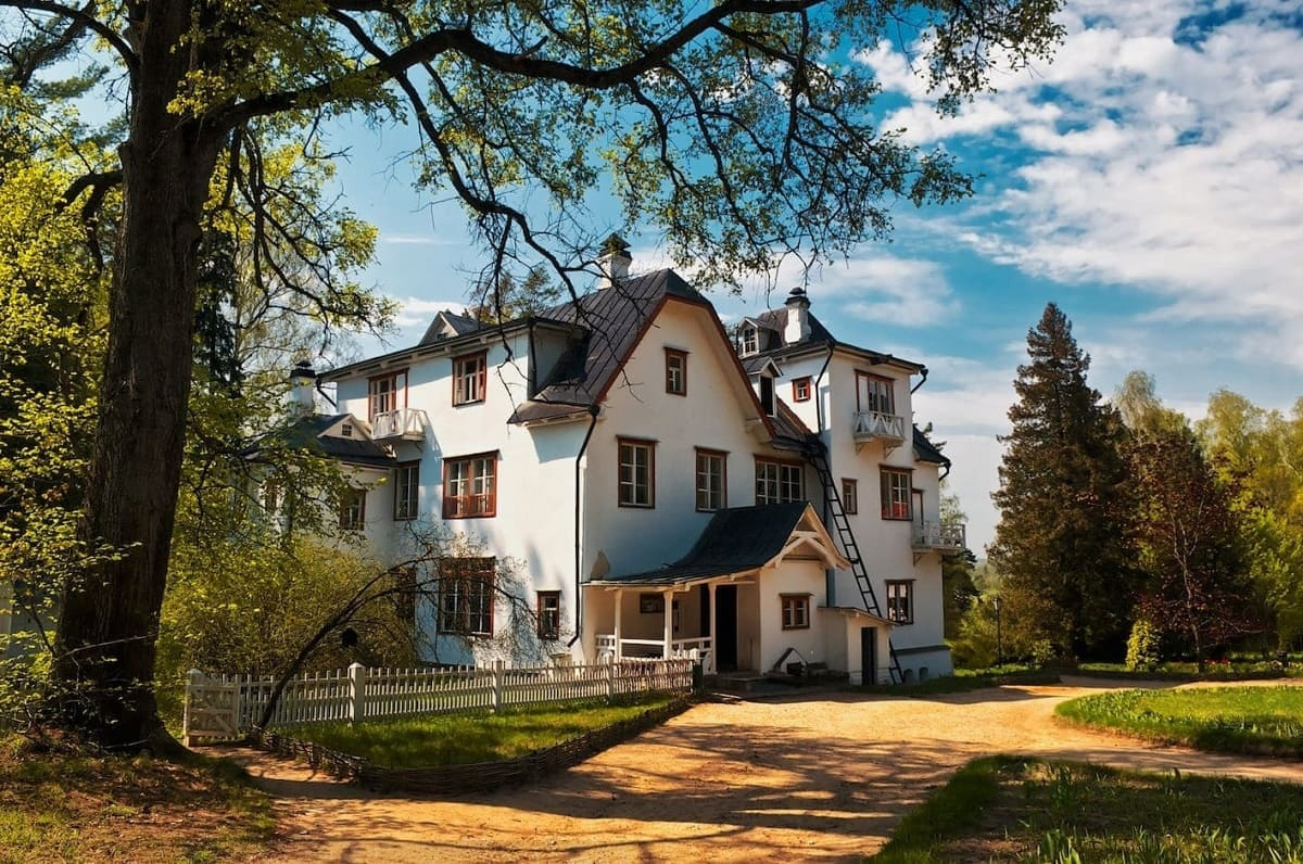 Основной дом. Отличается необычными архитектурными решениями. Тут можно увидеть и различные формы оконных проемов, и нестандартные балконы. Здание состоит из трех этажей. Построено оно из дерева. На первом этаже расположены детская комната для игр, личный кабинет, семейная библиотека и столовая. На втором этаже 2 рабочие комнаты – мастерская и пейзажная.
