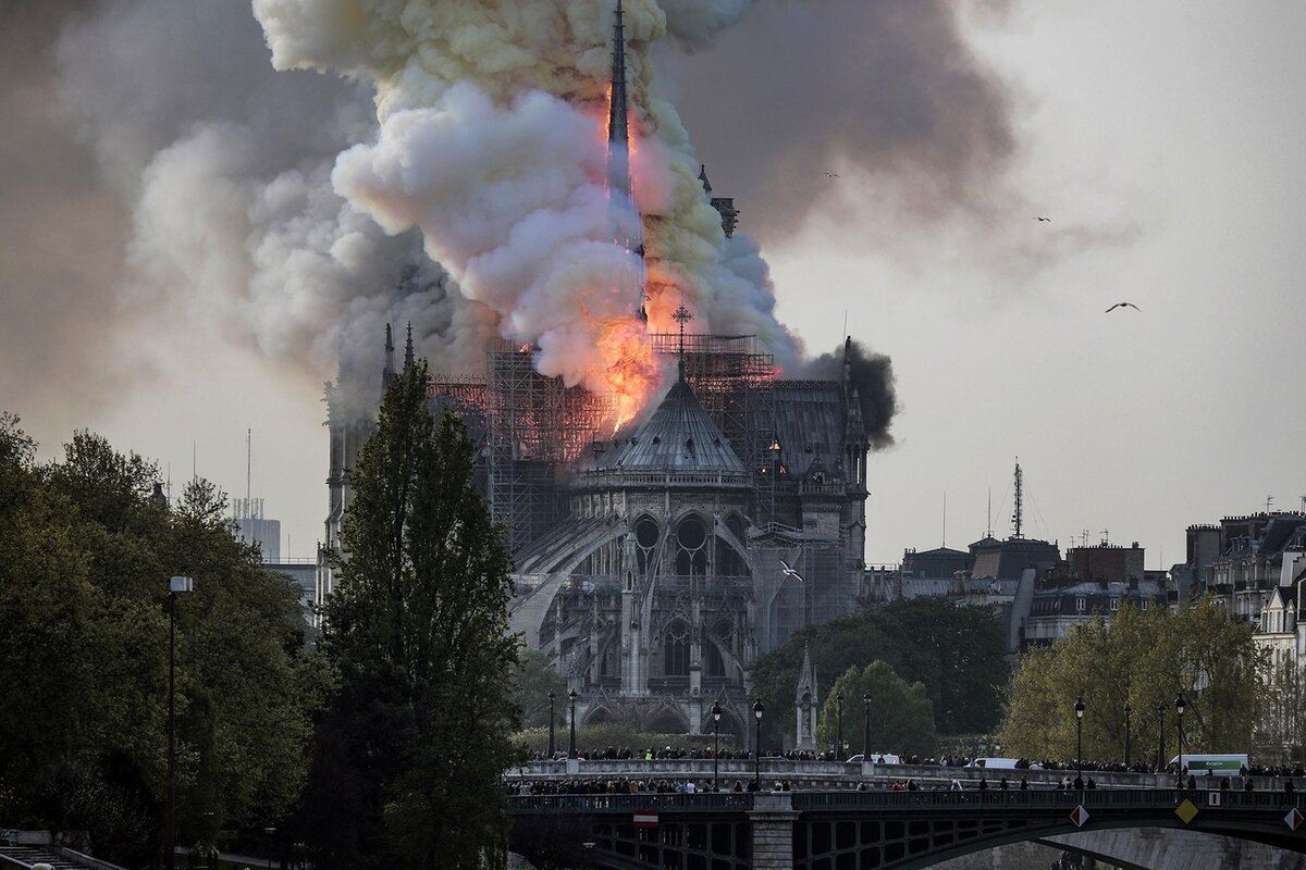 Собор вспыхнул как спичка. Сначала загорелась крыша, потом чердак, обрушился 750-тонный почти стометровый шпиль, проломив каменные своды. Пострадали химеры и горгульи на фасадах, большой и хоровой органы, «майские» росписи, колокола шпиля и крыши. Сгорел готический дубовый каркас над средокрестием. Сгорела вся кровля, созданная в XII–XIII веках. Покрывавшие её свинцовые пластины расплавились и потекли внутрь храма.