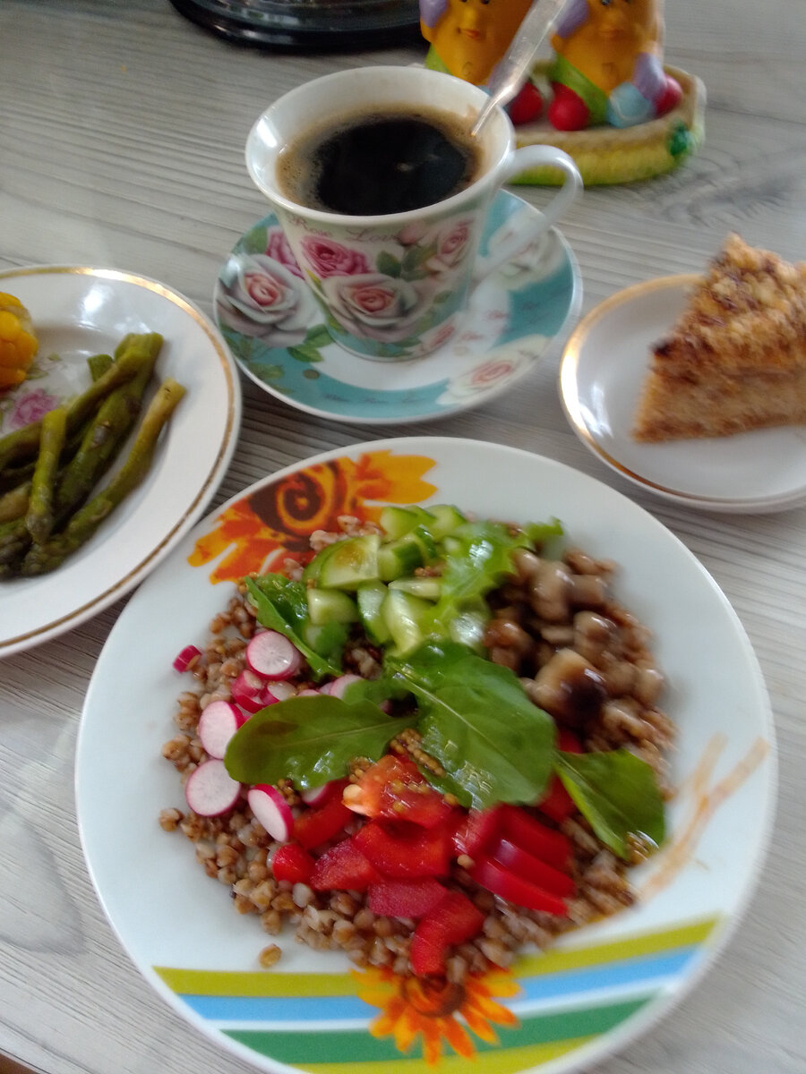 Добрый день, дорогие подписчики и гости моего канала. Я приглашаю вас на мою кухню, где покажу вам наше бюджетное и вкусное меню на день. Какое сегодня солнечное утро, хотя температура всего – то лишь + 2, но думаю, что денек разыграется и даст ради праздника нашего детства ударно потрудиться в саду. Планов опять громадье: надо высаживать огурцы в теплицу, пока они еще живы, много рассады цветов, которые тоже просятся на «большую» землю. А пока надо заняться завтраком, муж уже позавтракал и возится во дворе с мотоблоком. А на завтрак у меня сегодня веган – боул из гречки, редиса, свежего огурца, красного болгарского перца и маринованных опят, сверху бросила еще листья салата и руколы. Главное в боуле это заправка, которая придает вкус всему остальному. Сверху можно посыпать еще жареным кунжутом, но я про него забываю, не будет лишним, если еще поперчить свежемолотым перцем, но у меня нет мельницы. Впервые в этом году срезала и приготовила спаржу, растет она нынче очень медленно и ва