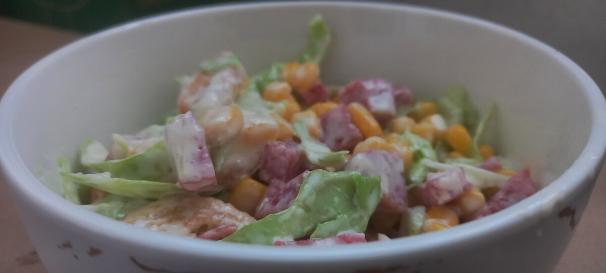 Майонез - по вкусу. Наша тактика: Представляю все ингредиенты который я использовал для приготовления данного блюда 1. Нарезаем сырокопченую колбасу в произвольной форме. 2. Добавляем к сырокопченой колбасе консервированную кукурузу. 3. Нарезаем капусту в произвольной форме и смешиваем с нашими ингредиентами. К ним также добавляем сухарики. 4. Заправляем майонезом и всё хорошенько смешиваем. Приятного аппетита и новых кулинарных успехов! Подписывайтесь на мой канал , дальше будет еще интереснее! ❤❤❤ #салат #капуста #еда #рецепты #простой салат #салатик #кукуруза #вкусно #быстрый салат