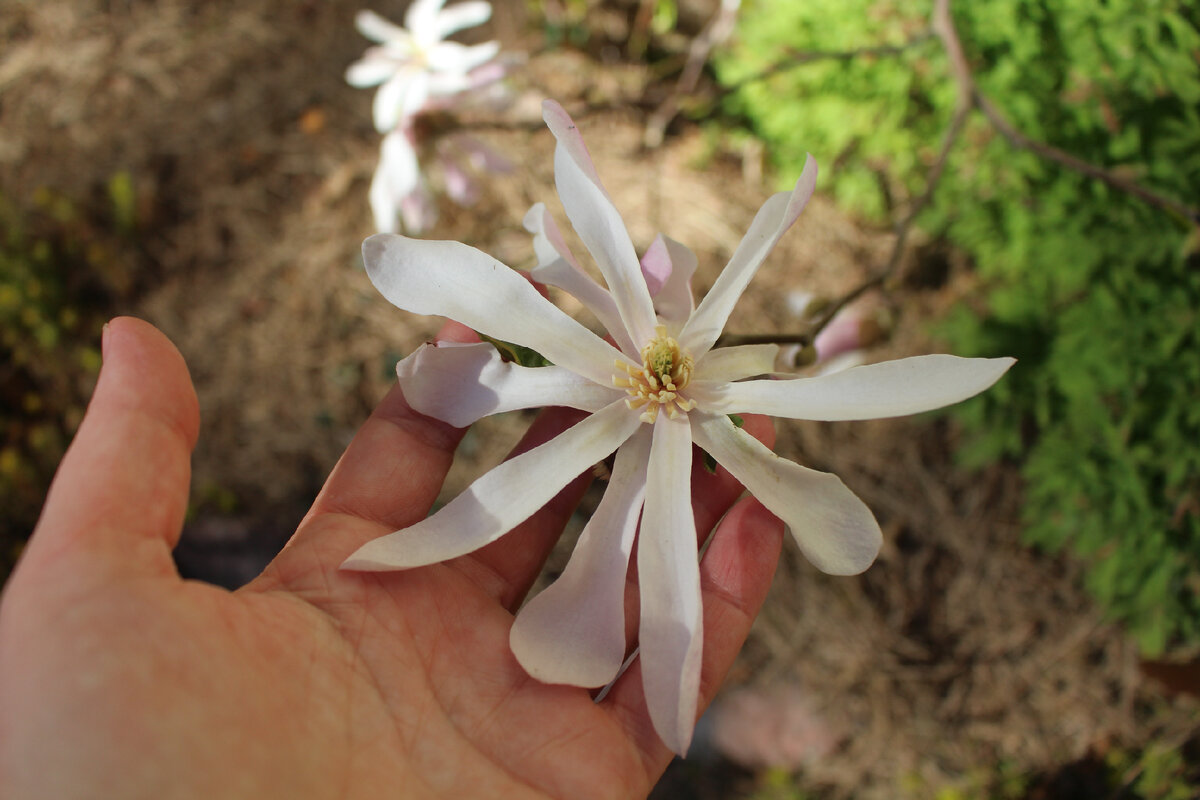 Вот так старались: Но праздника цветения магнолий, на который обычно приходят соседи и друзья, в этом году не будет. Потому что общий вид растений всего лишь такой: Вместо ставшего уже привычным вот такого: Нормально цветет только та ветка, что оказалась под снегом: На остальных я вижу вперемешку нормальные цветки: Подмороженные: Тормозные и только готовящиеся к цветению: И в принципе замершие почки: Кроме последних, все это развивается в разное время: где-то бутон, где-то лезет лист, а что-то уже осыпается: Так что общего вида - ну никакого... Но они старались! На фоне вымерзшей половины куста рододендрона Ледебура, который исходно пришел к нам из Алтая, Саян и горных районов северной Монголии и переносить -30 этого года обязан просто по умолчанию: ... на фоне вот такого отвратительного состояния рододендронов PGM, которые тоже давно и однозначно признаны морозостойкими как минимум до -32: ... магнолии - просто молодцы! Это магнолии звездчатые (Magnolia stellata) Rubra, и подозреваю,