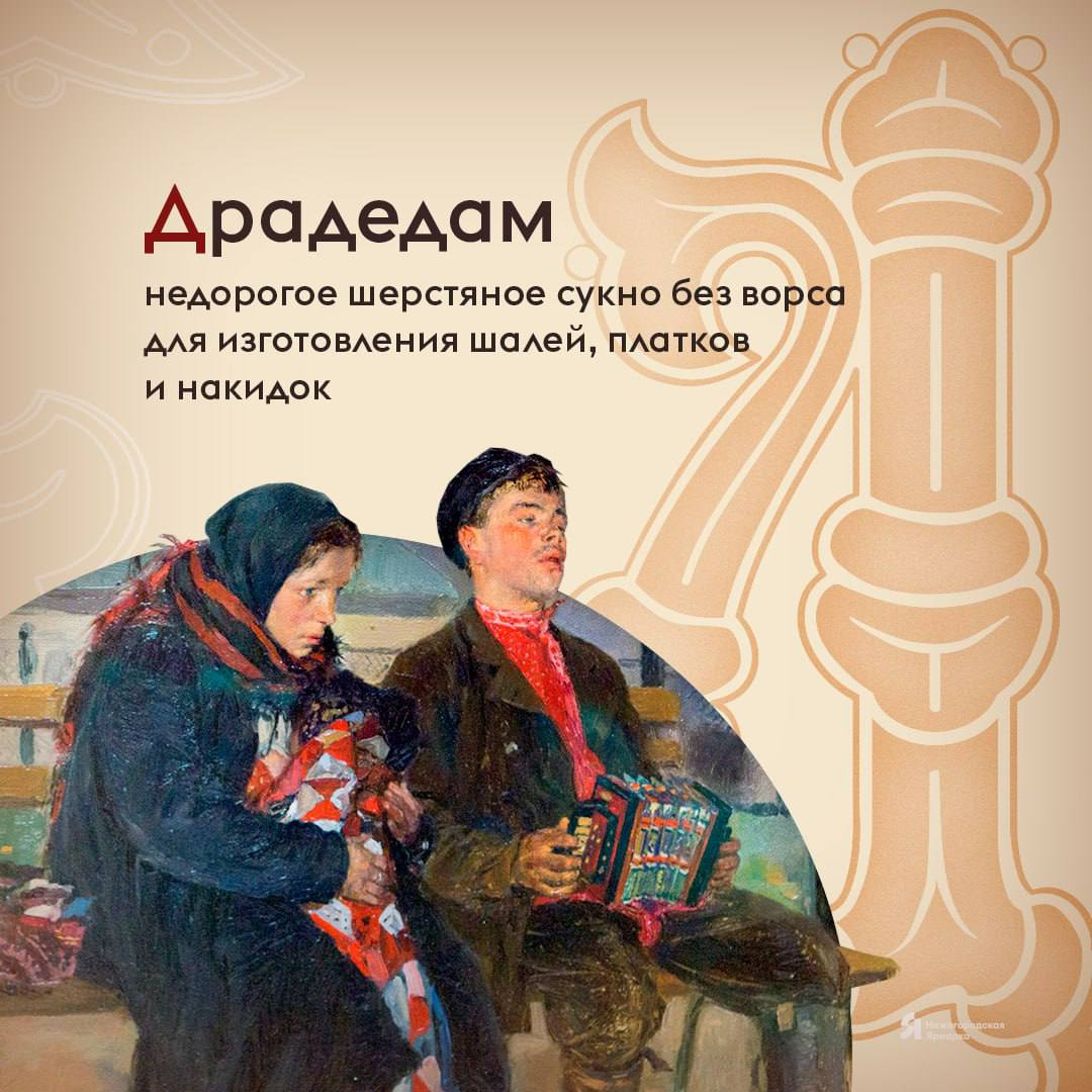 На французском языке «drap de dames» буквально означает «драп для дам». Это легкое шерстяное сукно, при этом прочное и недорогое. Его использовали для изготовления платков и шалей – теплых и долговечных. Поэтому драдедам так ценили небогатые люди, для которых была важна не только цена, но и практичность.