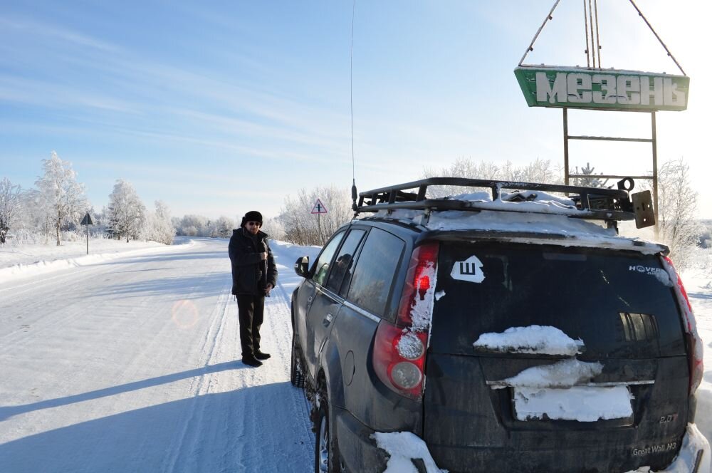 По пути мы снова встретили синюю почтовую "буханку". Интересно, неужели по всему району ездит только одна такая машина? Где-то ближе к Мезени мы увидели дорожный щит с предупреждающей надписью о въезде в пограничную зону. Мезень к тому моменту не была погранзоной уже четыре года (с тех пор, как 20-километровую прибрежную полосу заменили на пятикилометровую), а щит до сих пор стоял. А уже перед самой Мезенью мы выехали на пригорок - и нам открылись виды сумасшедшей красоты: всё было белым-бело на много километров вокруг. Останавливаться фотографировать я не стал, чтобы не будить задремавшего Сашу. Мы съехали с пригорка и въехали в город Мезень. Достигли на пятый день цели своего путешествия.