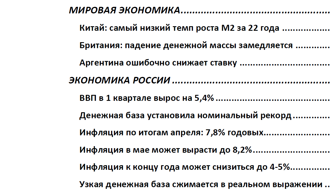 - Инфляция по итогам апреля составила 7,8%, а в мае может вырасти до 8,2%. К концу года инфляция вполне может опуститься до 4-5%.