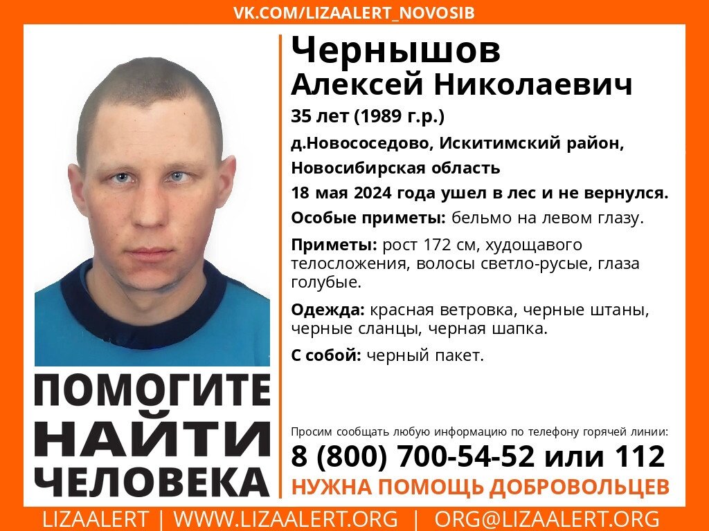 В Новосибирской области пропал Алексей Чернышов. Местонахождение 35-летнего мужчины неизвестно с 18 мая 2024 года, сообщает поисковый отряд «ЛизаАлерт». Сибиряк из деревни Новососедово в этот день ушел в лес и не вернулся. Приметы пропавшего рост 172 см, телосложение xудощавое, цвет глаз голубые, волосы светло-русые. Мужчина был одет в красную ветровку, черные штаны, черные сланцы и черную шапку. С собой у него был черный пакет. Из особых примет — бельмо на левом глазу. Если вам что-либо известно о местонахождении пропавшего, сообщите, пожалуйста, по телефону горячей линии отряда 8-800-700-54-52 (круглосуточно, бесплатно) или по номеру 112. Ранее мы писали, что в Новосибирске с 7 мая не могут найти 44-летнего Андрея Мариненко. Вячеслав Зубарев