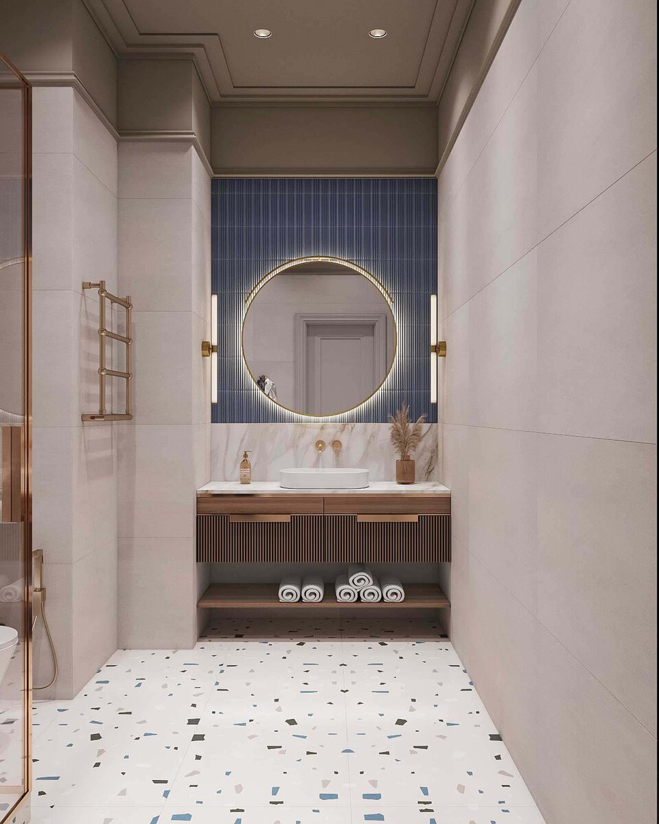 Ванная расположена в приватной части квартиры, предназначена для двух спален. В третьей спальне есть своя ванная комната с отдельно стоящей ванной, которую уже показывала ранее Площадь ванной комнаты почти 8 кв.м. Яркая синяя плитка за зеркалом в сочетании с фактурой дерева на тумбе и латунные элементы сантехники сделали этот интерьер. Подсветка за зеркалом выявляет рельеф на плитке и делает синюю плитку еще более интересной и притягивающей взгляд. А керамаогранит с необычными крупными вкраплениями синих элементов гармонично сочетается с акцентной стеной. Уравновешивает и придает спокойствие этому пространству потолок сложного оттенка пыльно-коричневой гаммы.