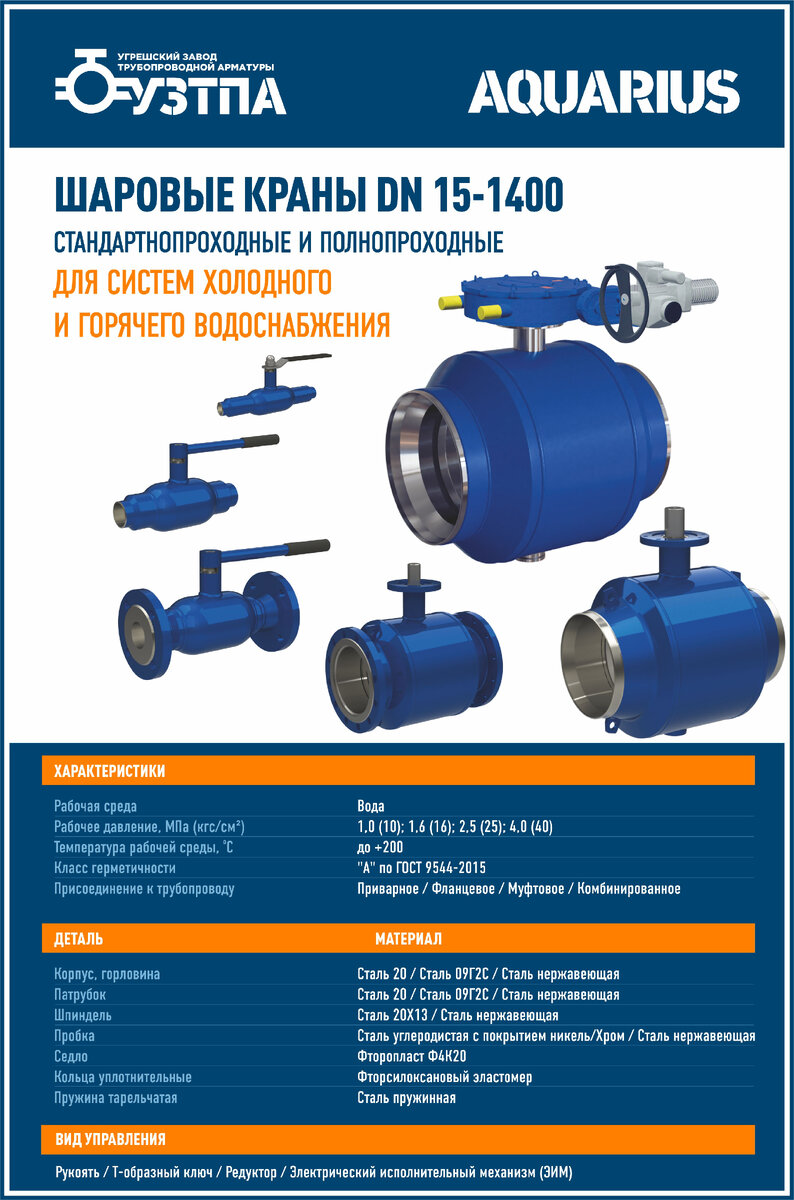 Каталог шаровых кранов: https://uztpa.ru/katalog/sharovye-krany-aquarius/ Цена по запросу. ДОКУМЕНТАЦИЯ Сертификаты на продукцию: https://uztpa.ru/documents/sertifikaciya/sharovye-krany-aqarius/ ДЕКЛАРАЦИЯ СООТВЕТСТВИЯ ТР ТС № 010/2011 СЕРТИФИКАТ СООТВЕТСТВИЯ ТР ТС № 032/2013 СЕРТИФИКАТ СООТВЕТСТВИЯ ТР ТС № 032/2013 ФИТОСАНИТАРНЫЙ СЕРТИФИКАТ ФИТОСАНИТАРНЫЙ СЕРТИФИКАТ НА КИСЛОТНЫЕ И ЩЕЛОЧНЫЕ СРЕДЫ Информация о заводе УЗТПА: