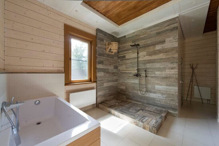 В ванной комнате допустимо использовать любой влагостойкий отделочный материал для стен, включая гипсокартон. Однако наиболее популярным и практичным вариантом является сочетание материалов: покрыть основную часть стен деревянной вагонкой, а области, подверженные воздействию воды, облицовать керамикой. Также возможно обшивать стены ванной устойчивой к плесени древесиной лиственницы или тиса.