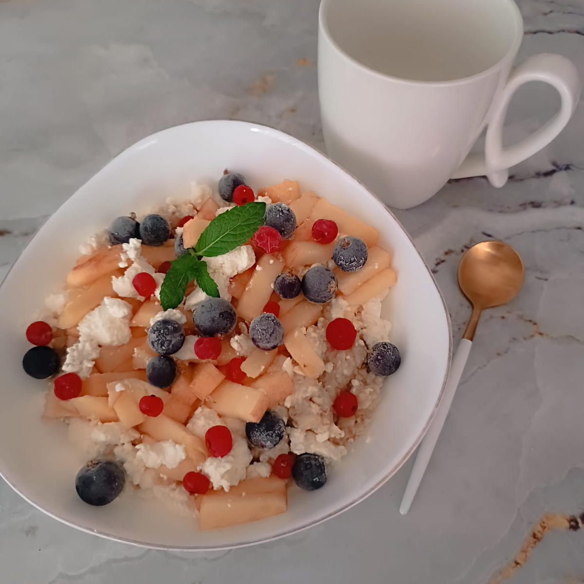 Завтрак без яиц , день 1ый. Овсянка с творогом, яблоками и ягодами.