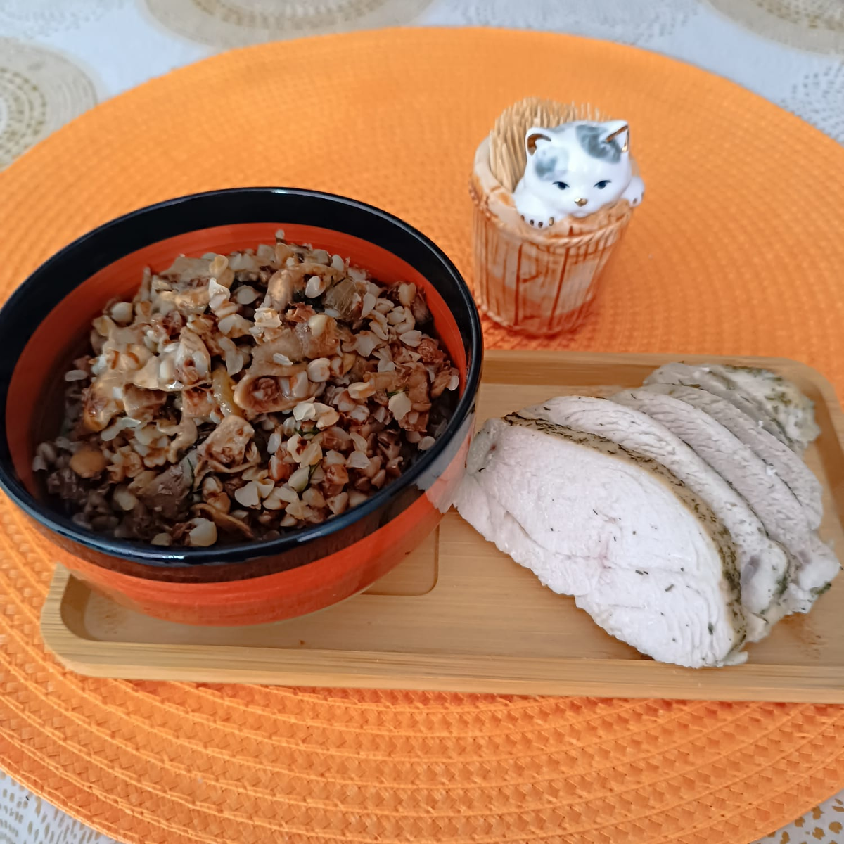 Вообще я хотела уже переходить на всякоблины, потому что не пекла их с Масленицы и соскучилась ) исключение было на Радоницу. Но любопытсво победило и я запустила безъяичный марафон ) всякоблины будут после него ) Гречу, как и овсяные хлопья, я заливаю кипятком с вечера 1:2. И утром она готова. Зажарку с грибами приготовила отдельно - обжарила на топлёном масле грибы с луком . И смешала с гречкой. Грудку запекла 15 минут, сдобрила сливочным маслом и оставила в духовке до полного остывания. Как обычно, она получилась мягкая, нежная и сочная ) На 2 порции :