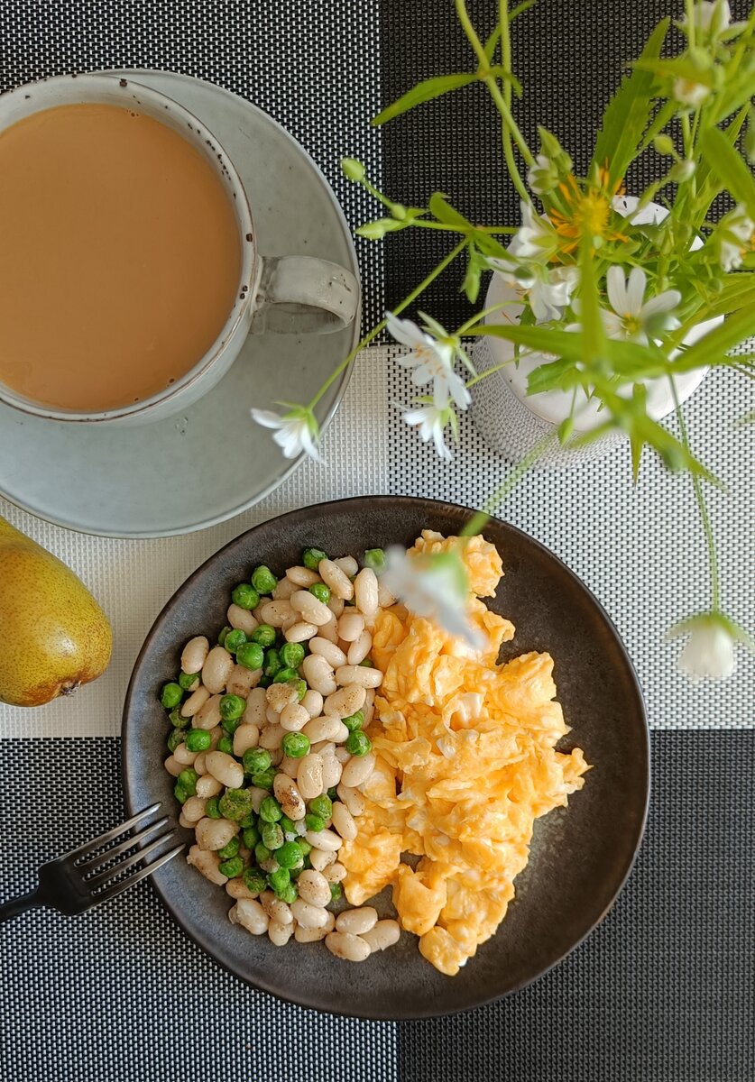 - Белая фасоль и зелёный горошек с сушёным чесноком и молотым перцем