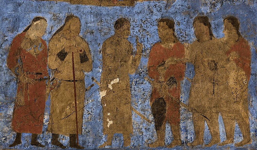 Особое место в нашем исследовательском контексте занимает настенная живопись конца VII– начала VIIIв. среднеазиатского городища Афрасиаб. По мнению изучившего и опубликовавшего фрески исследователя Л.И. Альбаума, «эти росписи могут рассматриваться и как первостепенный исторический источник, не только проливающий новый свет на идеологию, верования, обряды, мифологию и другие области культуры народов Средней Азии VI– VIIIвв., но и позволяющий точнее судить о многих явлениях материальной культуры – от архитектуры до вооружения, одежды, украшений и инсигний знати, а также о физическом облике, антропологических типах и, соответственно, об этническом составе населения» [Альбаум 1975. С. 108]. «Афрасиабские росписи создают уникальную возможность характеризовать костюм ранних тюрков, поскольку, в отличие от каменных изваяний Степи VI-VII вв., он передан в цвете и во всех деталях» [Яценко 2010].