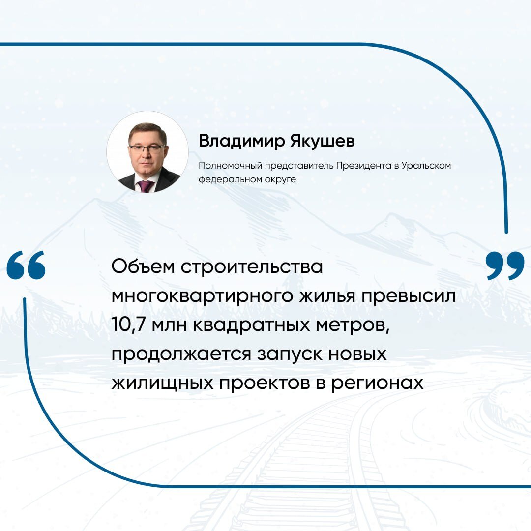 Полпред Владимир Якушев отметил, что общий «банк» строящегося на Урале жилья превысил 10,7 млн квадратных метров. Почти 70% строительства сконцентрировано в Екатеринбурге и Тюмени.