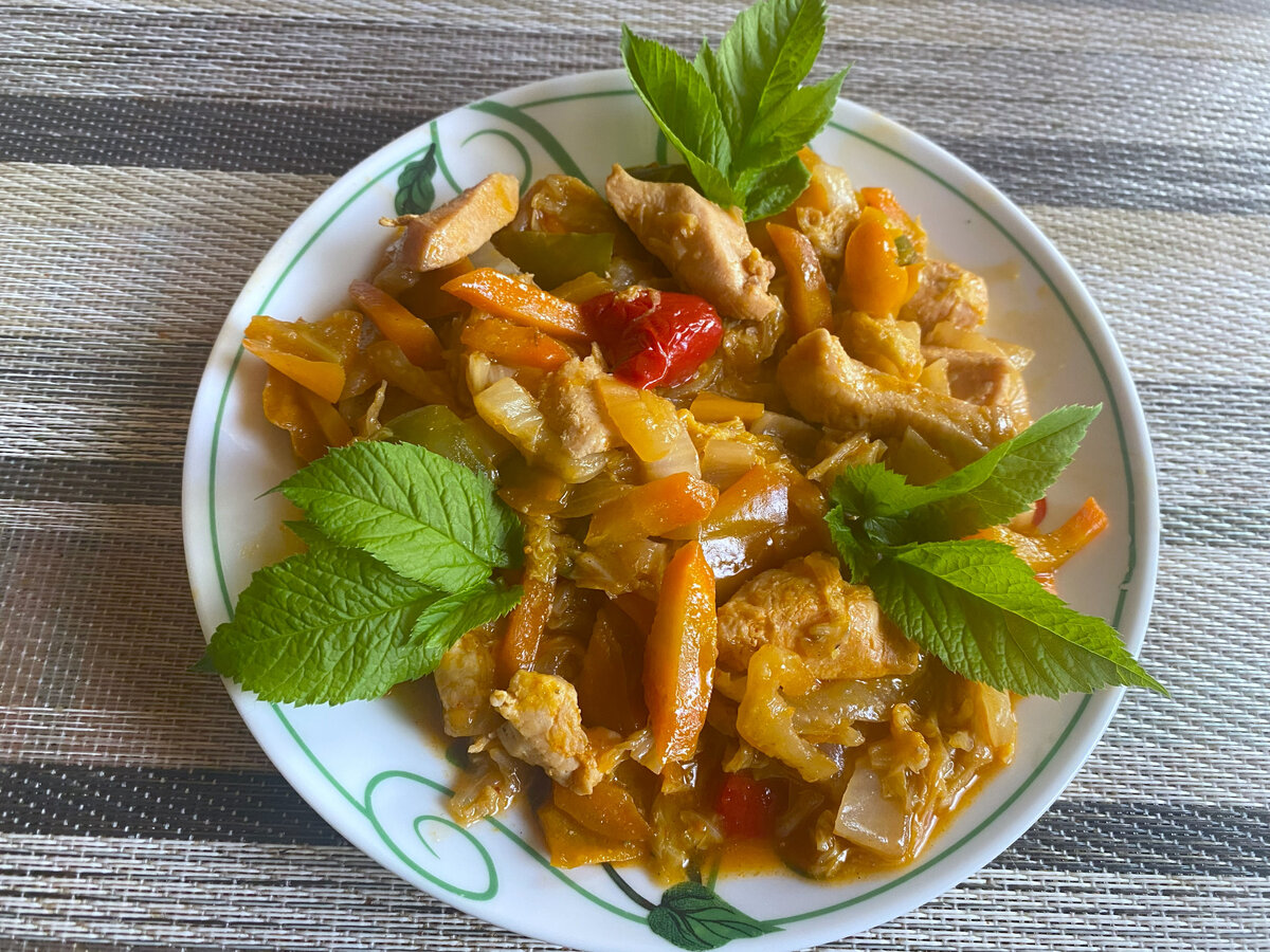 Купила на маркетплейсе соус кимчи, планировала приготовить пекинку как закуску. Не успела. Вернулись вчера с прогулки на Каму, загуляли, пока есть не захотели, потребовалось срочно приготовить обед, тут-то я и поменяла планы. В ход пошла пекинская капуста и куриная грудка, её проще всего быстро разморозить. Даже не предполагала, что экспромт будет настолько вкусным, что мы не остановимся, пока не доедим всё. Достала кусок куриной грудки из морозилки, отправила в микроволновку на 40 секунд, после чего её можно легко нарезать брусочками. Отложила в сторону, принялась за овощи. Пекинку разрезала пополам, потом половинку еще раз пополам и нарезала все квадратиками. Очистила морковь и лук,