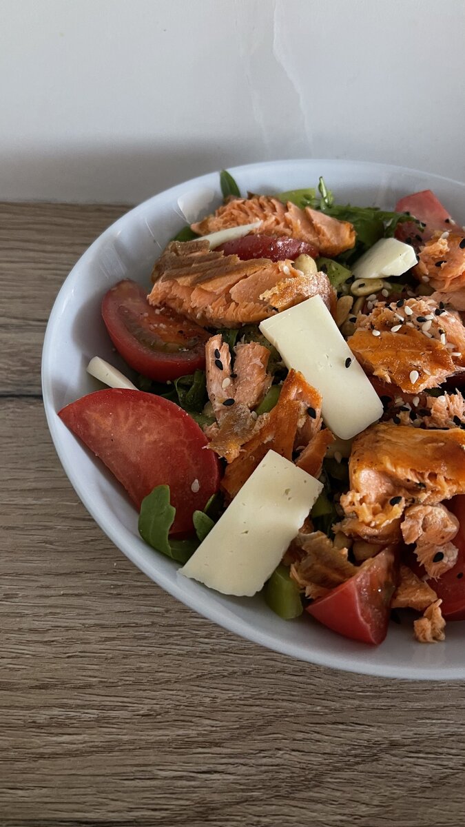 Нам понадобиться : Рукола или другая любая листовая зелень 1 лоток (125 г) 1 спелый помидор 1 перец сладкий Рыба (форель ,треска ,семга )150 гр Соль,перец по вкусу Яблочный уксус 1 ст .л Оливковое масло 1 ст.л Сыр несколько ломтиков Орехи (арахис или кешью жареный )2 ст.ложки для украшения Кунжут Приготовление: Выкладываем зелень на тарелку ,нарезаем овощи и выкладываем сверху добавляем специи ,яблочный уксус ,оливковое масло (можно еще немного соевого соуса или бальзамического ) Обжариваем рыбу на сливочном масле до золотистого цвета на среднем огне ,нарезаем и добавляем в салат ,украшаем орехами кунжутом и сыром . Приятного аппетита 🦦 Любите то что делаете 🤍