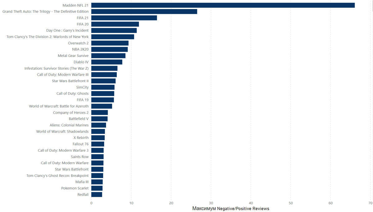 Не забугорным Reddit'om единым искать интересные инфоповоды. На днях наткнулся на интересное статистическое исследование на DTF. Подписывайся на канал. Нас уже 18000! Не забудь поставить лайк! Там пользователь под ником Карасик показал, что если взять игры, получившие от 1000 отзывов, и разделить количество положительных отзывов на количество отрицательных, то получится следующая картина. Madden NFL 21 Типичный спортивный симулятор от Electronic Arts с типичным набором проблем, главной из которых являются минимальные изменения из части в часть. То есть выходит новая игра, в которой все практически тоже самое, но ее нужно покупать заново, а внутри вас еще и ждут микротранзакции. Grand Theft Auto: The Trilogy — The Definitive Edition Пожалуй, первый случай, когда великая Rockstar выдала откровенно некачественный продукт. До этого за компанией водилась слава жестокого работодателя, маринующего своих сотрудников в кранчах ради того, чтобы выдавать супер качественный продукт. Масло в огонь