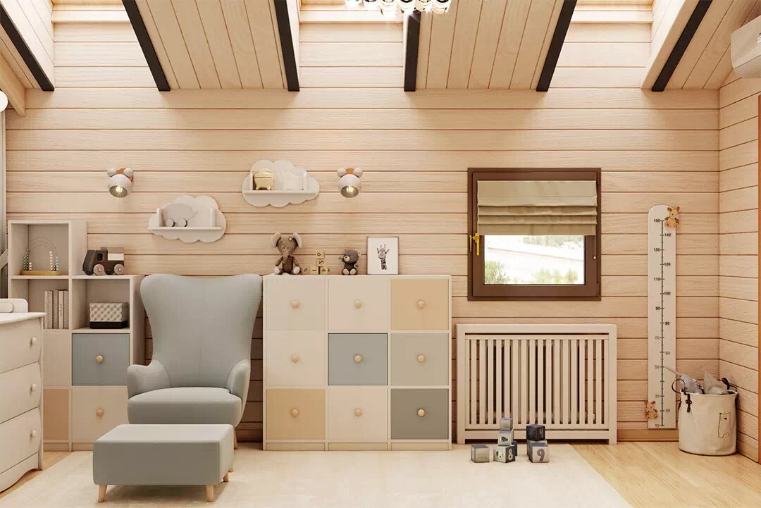 Мебель для детской комнаты новорожденного ребенка в теплых тонах с авторским декором. Фото и описание проекта смотрите здесь Этот нежный дизайн комнаты создает мягкую и безопасную атмосферу о, где каждый элемент мебели для новорожденного спроектирован для комфорта и удобства. Использование светлых деревянных тонов и пастельных оттенков подчеркивает спокойствие пространства. Просторная комната с мягким ковром и большим количеством естественного света. В углу комнаты расположено удобное кресло для кормления с подставкой для ног, что делает уход за ребенком максимально комфортным. По бокам невысокие шкафчики для хранения игрушек, одежды и средств гигиены с разноцветными фасадами. С другой стороны комод, совмещающий функцию пеленального столика с объемными, словно объемными, ящиками. Книжные полки в виде облачков идеально дополняют милое пространство. Также тут предусмотрен деревянный ростомер, где можно будет делать обозначения роста подрастающего ребенка. Стенка, у которой расположена ко