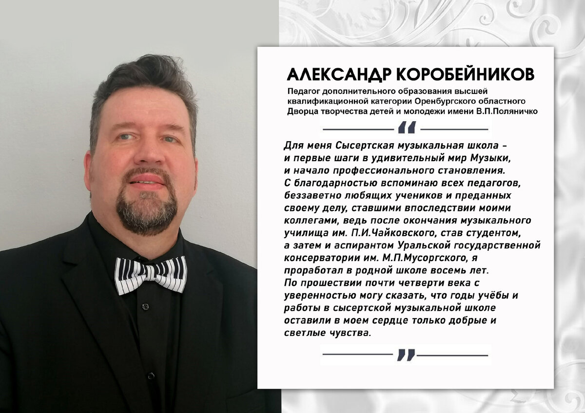 Имена некоторых выпускников сысертской ДШИ широко известны не только в России, но и за рубежом. Нам удалось связаться с некоторыми выпускниками. Теплыми воспоминаниями об учебе в сысертской музыкальной школе, любимых преподавателях известные музыканты, певцы и педагоги поделились с читателями Сысертских вестей.