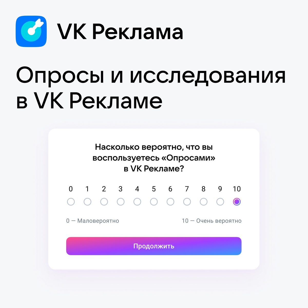 Это новый инструмент VK Рекламы, с помощью которого можно запускать конкретные варианты опроса рекламой на определенные сегменты аудиторий.