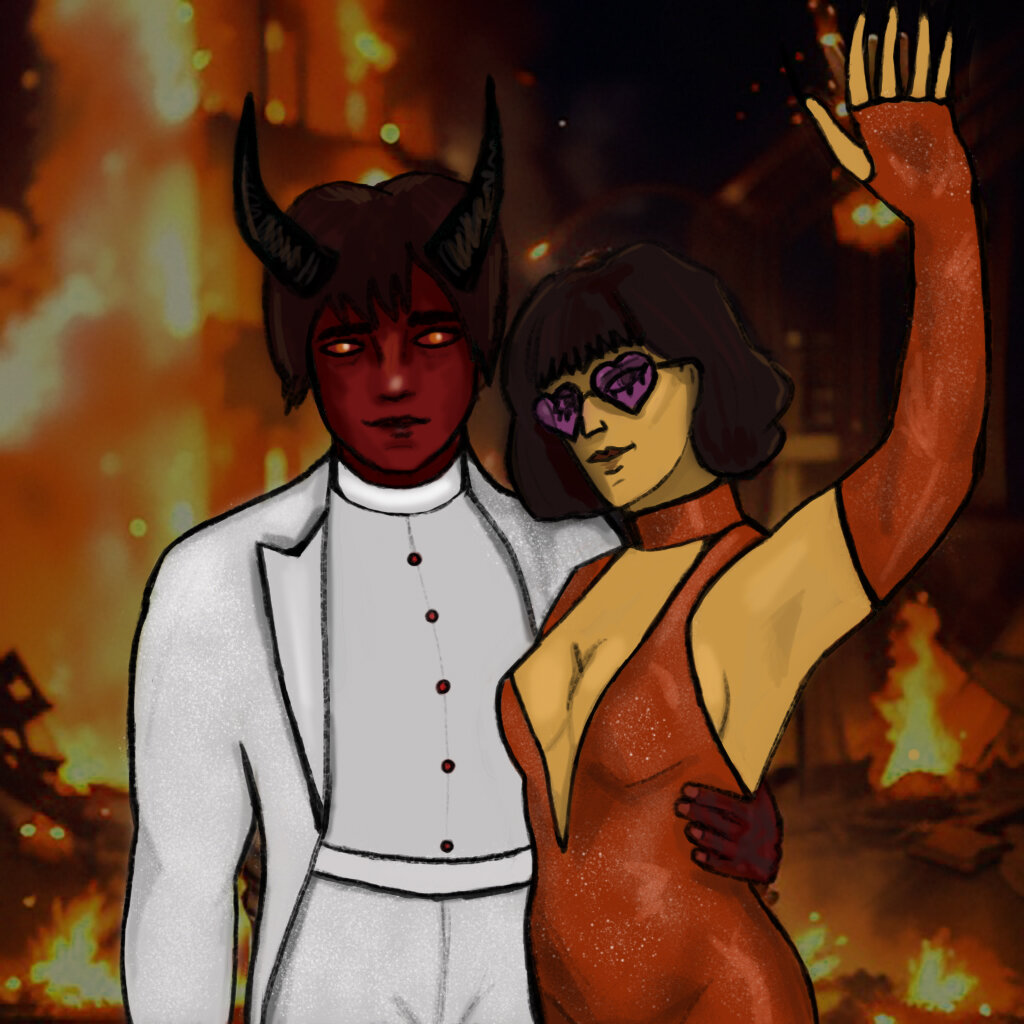 Дьявол поправил воротник своей любимой белой рубашки. Сегодня был особенный день — и поэтому выглядеть хотелось по-особенному хорошо. Диско не отставала в стиле от своего партнёра — она была в красном обтягивающем блестящем костюме, с расклешёнными книзу штанинами. Она поправила очки-сердечки и направилась к зданию «Рок-н-ролл Пиццерии».