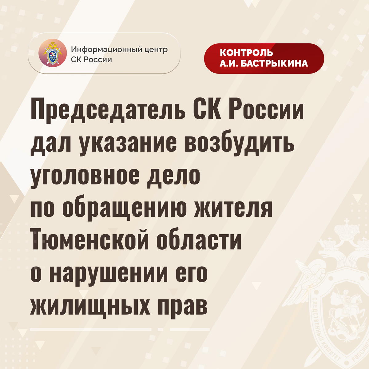 Председатель Следственного комитета Российской Федерации Александр Иванович Бастрыкин дал указание руководителю СУ СК России по Тюменской области Александру Александровичу Куб