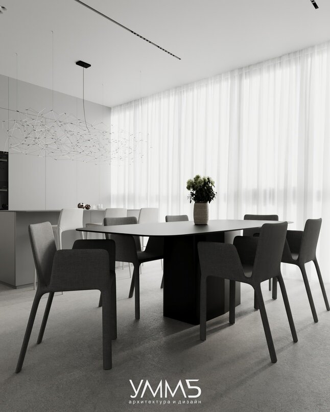 По желанию заказчицы в столовой обязательно должен быть расположен большой обеденный стол. Над ним установлено трековое освещение, которое будет дополнением к большому количеству естественного света с панорамных окон. Стены здесь выкрашены в теплый бежевый тон, на полу так же продолжается широкоформатный керамогранит.