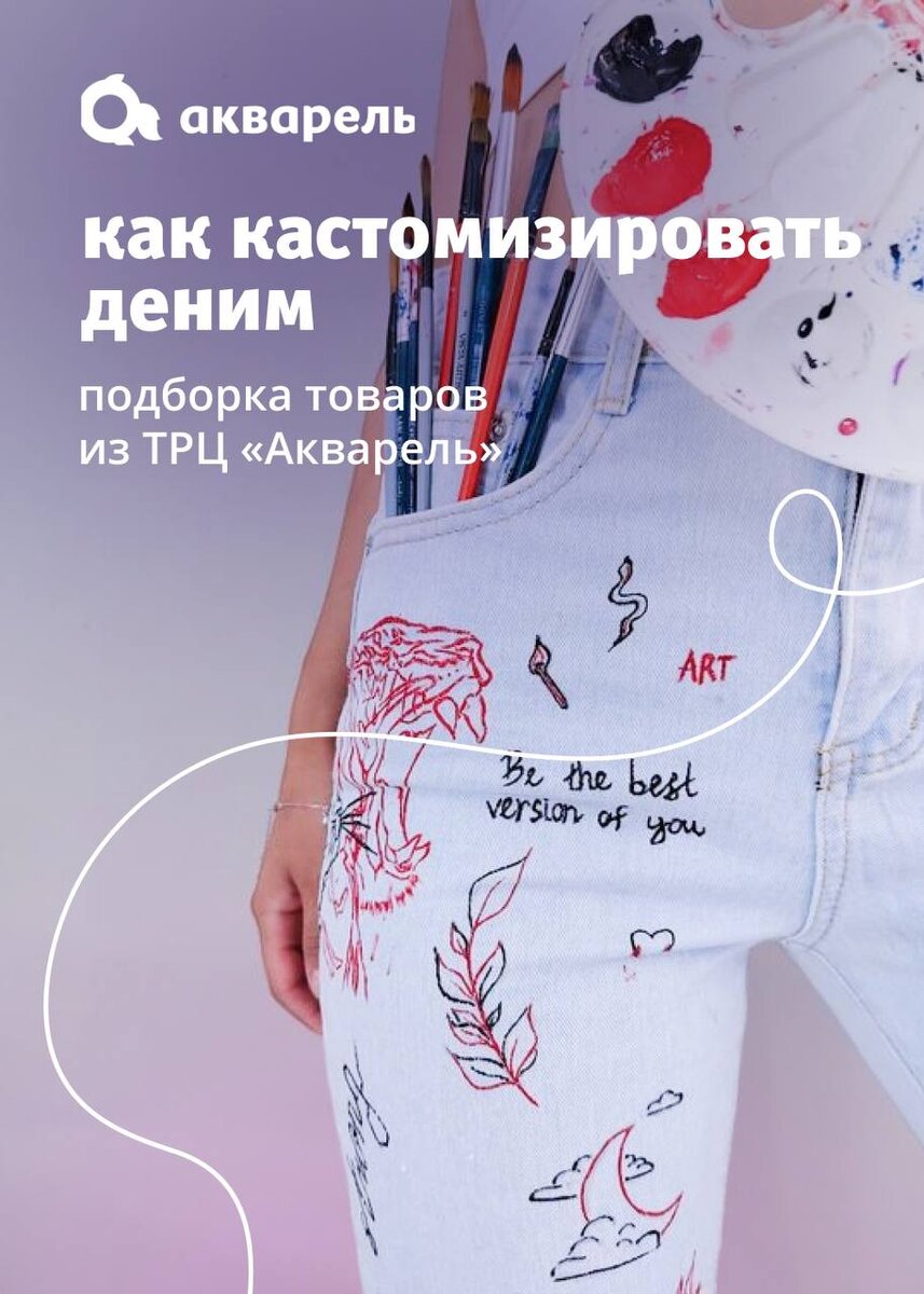 На карточках разместили интересные модели джинсов и джинсовых курток, которые можно креативно кастомизировать аксессуарами из магазинов «Акварели».