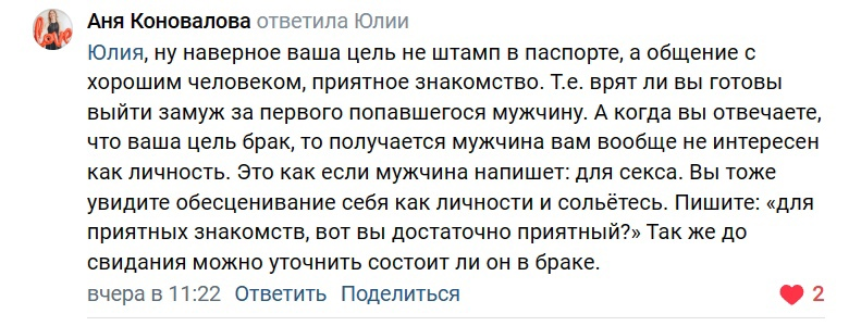 Хороший вопрос и хороший ответ. Нашла в комментариях на странице у одного известного семейного психолога. (На каждого известного психолога всегда подписаны сотни других не менее хороших, но пока менее известных психологов). Девушка в комментариях спросила: "Зарегалась на сайте знакомств. Когда мужчины у меня спрашивают, зачем я зарегалась, что мне отвечать? Говорю, замуж хочу, они сломаются, а что еще отвечать?" Видимо, девушка имела в виду, что они сливаются. Я это тоже заметила и меня тоже долго мучил этот же вопрос. Пока я опытным путём не пришла к формулировке "ищу мужчину, чтобы познакомиться, а там как пойдёт". Так они стали меньше от меня шарахаться )) А этой девушке в комментариях начали сыпать такую дичь в ответ - обалдеть! Вот перл от одного из подписчиков (от мужчины причём): "Хочешь замуж, выйдешь замуж за пьяницу или похотливого кобелька. Свои желания нужно правильно формулировать. Хочу быть Любящей Женой Достойному Мужчине, который захочет взять меня за себя заМуж и зах