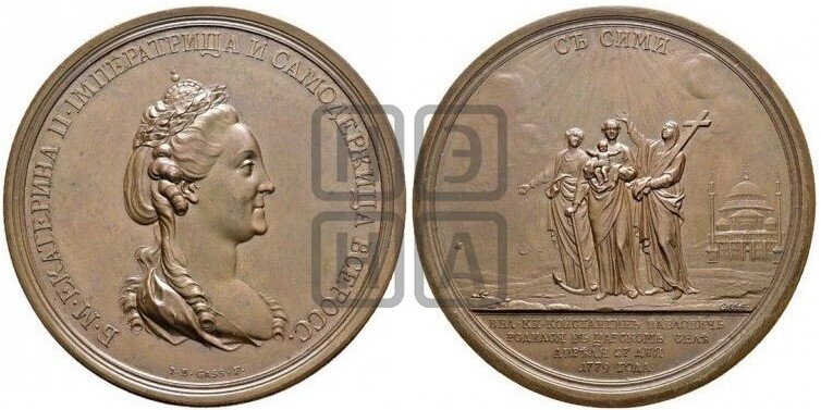 Сразу после рождения Екатерина II (1729 – 1796) забрала новорожденного у родителей. Императрица планировала восстановить Византийскую Империю, а Императором предполагала назначить своего второго внука, поэтому нарекла младенца Константином, и на медали изобразили храм Святой Софии в Константинополе. Идею ей подсказал Г.А. Потемкин (1739 – 1791) и к этому располагала геополитическая обстановка.