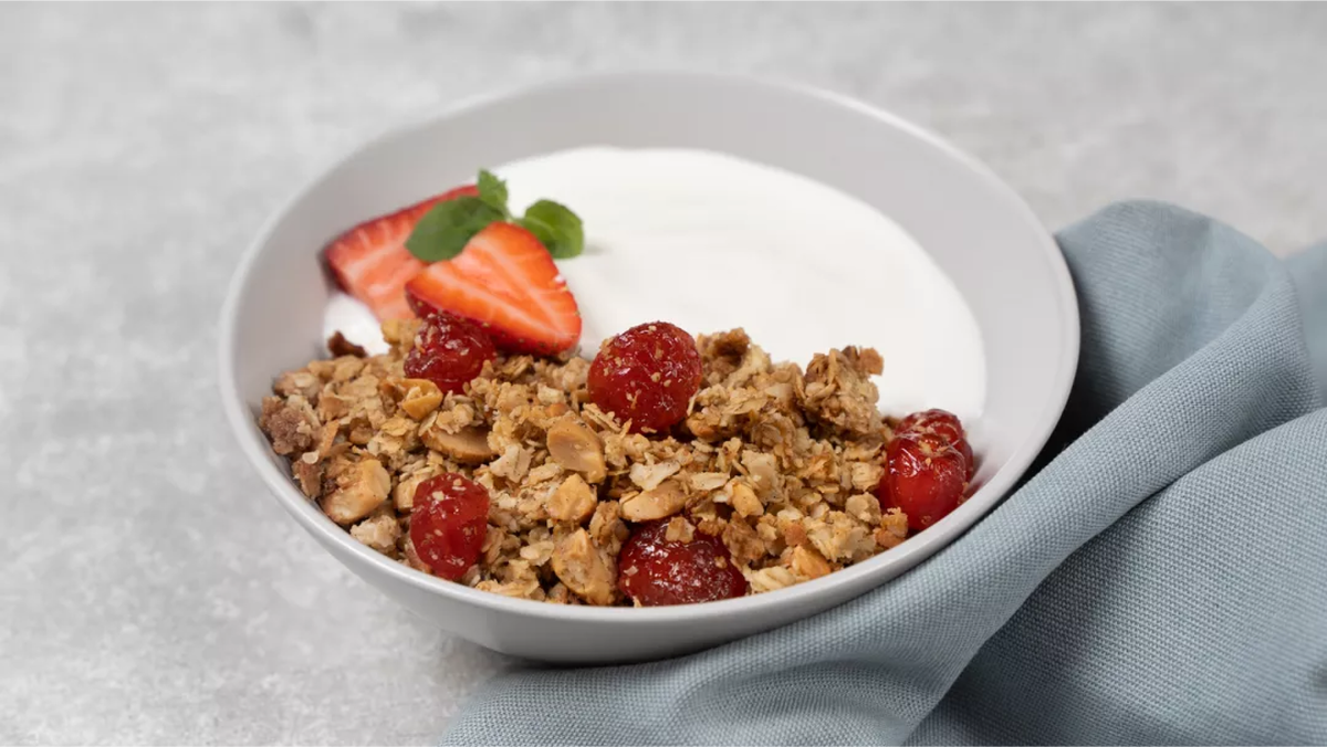 Запеченные овсяные хлопья с орехами и сухофруктами, известные как гранола, могут стать вкусным, но диетическим завтраком или питательным перекусом. В первом случае при запекании их слегка помешивают, во втором формируют в небольшой батончик. Сахар и кленовый сироп можно заменить медом, а вместо кокосового масла взять оливковое или кунжутное. Для гранолы лучше подойдут самые крупные овсяные хлопья.