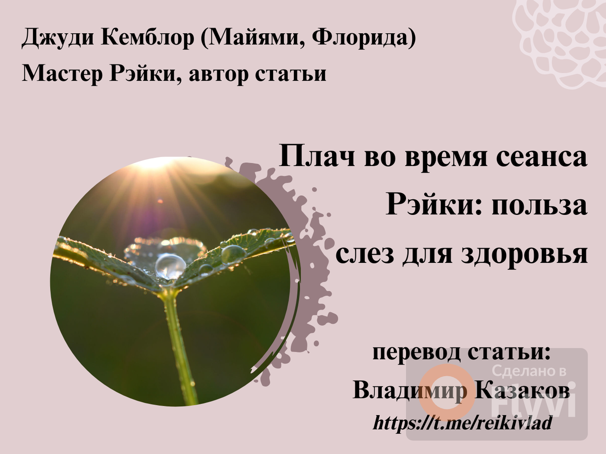 За годы моей практики я встречала много клиентов, которые плачут во время сеансов. Все они извиняются за то, что им трудно сдерживать слезы. Они думают, что плачем они либо влияют на мой канал энергии Рэйки, либо нарушают медитативную концентрацию. Ни то, ни другое не является истиной. Мне пришлось использовать свое обучение в Рэйки на себе самой для собственного исцеления и я понимаю, что энергия Рэйки открывает чакры и энергетические каналы, которые закрыты или заблокированы из-за наших собственных попыток подавить наши эмоции. Плач не случается только когда мы грустим из-за потери. Плач может возникнуть, когда мы злимся или когда находимся в какой-то другой стрессовой ситуации. Часто мои клиенты приходят с одним типом жалоб или недомоганий и уходят, открывая те части себя, на которые, как они даже не подозревали, влияют их эмоции и которые нуждаются в исцелении. Рэйки помогает высвободить известное и сокрытое. Когда мои клиенты извиняются за свои слезы, я говорю им, что приветствую