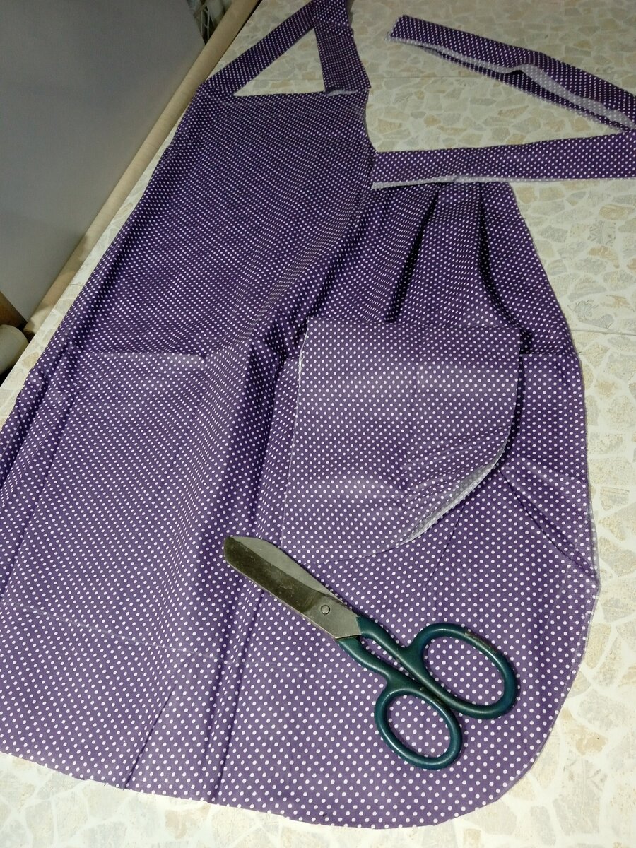 Сегодня сшила фартук на кухню. Фартук большой, полностью закрывает грудь и бока. Такой крой фартука гарантировано защищает одежду от пятен. Мерки, которые вам понадобятся: длина фартука, длина бретели и поясов, ширина нижней части фартука, ширина и высота верхней части фартука, ширина верхней части фартука после сборки, т.е. в готовом виде. Свои мерки не пишу, потому что рост и размер не стандартные и мало кому подойдут. Выкроила фартук, пояса, бретель, карманы. Рулик для отделки можно сделать из основной ткани или использовать готовый. Сначала стачала и вывернула бретель. Ширина бретели и поясов в готовом виде 4 см. Собрала верхнюю часть фартука на сборку. Бретель приколола, отступив 1 см. от боков. Обработала верх фартука руликом вместе с бретелью. Затем отвернула бретель вверх и закрепила строчкой. Застрочила и вывернула пояса. Верх карманов обработала подгибкой с закрытым срезом, Затем карман вкруговую обработала руликом. Фартук тоже вкруговую обработала руликом, Я сделала прямые у