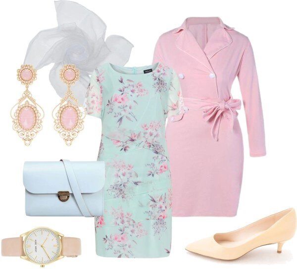 Одежда пастельной гаммы стала современной классикой. Сегодня оттенки уместны не только для костюмов первых леди, но и для утонченных романтичных девушек, а также тех. кто хочет казаться моложе лет на пятнадцать. Разберем несколько образов. Вариант 1 идеально подойдет для дам Plus-size. Конечно, в первую очередь из-за многослойности. Но это не главная фишка, которую мы будем обсуждать. Здесь нужно обратить внимание на принт платья и сочетание его оттенка с верхней одеждой. Цвет дублируется, а потому не проявляется излишняя тяжесть. К тому же нежные цветы средних размеров не имеют четких границ, а потому не добавляют веса образу. Возьмите на заметку, что с задачей отлично справятся изображения растительных сюжетов именно среднего размера, имеющие соцветия, а не бутоны. Летящий же шарфик в тон платью помогает вытянуть силуэт и придает образу дополнительную легкость. Таким образом мы размываем параметры модели. Женщина становится легкой, манящей. Еще один секрет легкости - в каблучке kit