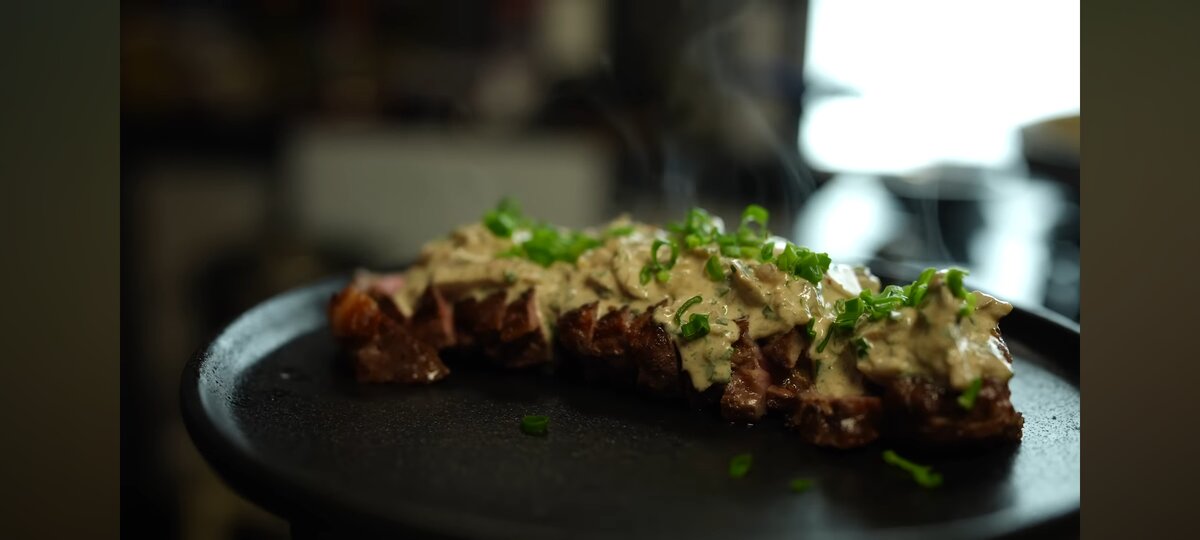 Берём в магазине любой стейк толщиной в руку, не надо там покупать супер дорогие томагавки стейк рибай, а берем самый обычный стейк который есть в любом магазине. Если у вас есть сувид то это очень хорошо, отправляем в сувид на 60 градусов стейки варится на 40 минут, но думаю у большинства нету сувиде поэтому жарим стейк по пол минут с каждой стороны на сильном огне будет готово до состояние медиум велл. Само собой перчим солим по вкусу поливаем сливочным маслом во время жарки для вкуса. Снимаем с огня и заворачиваем фольгой и отправляем отдыхать на несколько минут. Приступим к готовке соуса. Для соуса нам понадобится лук подойдёт даже обычный лук, крошим его на мелкую труху и пока в сторону. Потом берём 3 зубчика чеснока и так же весь чеснок в труху. Следующий наш ингредиент это грибы, подойдут любые белые грибы, для этого дела отлично подойдут обычные шампиньоны. Шампиньоны режем полукольцами не очень мелкими и не очень большими кусками. Петрушку размельчаем до состояния пы
