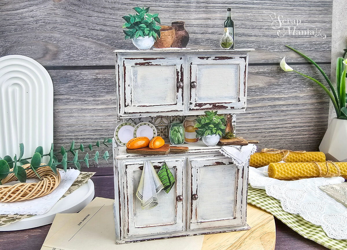 А что? Старый буфет есть. Вот он стоит, белый, со старой потертой краской, наверное, не раз перекрашенный и послуживший не одному поколению хозяюшек. Рецепты, которые в нем спрятались, тоже есть, ведь буфет представляет собой короб для карточек, на которых можно написать и название, и ингредиенты, и технологию приготовления самых вкусных блюд. Я выбрала вертикальный вариант карточек (это карточки из листов "Рецепты старого буфета. Вертикальный блокнот. Варенье", "Рецепты старого буфета. Вертикальный блокнот. Мясо", "Рецепты старого буфета. Вертикальный блокнот. Салаты", "Рецепты старого буфета. Вертикальный блокнот. Десерт", " Рецепты старого буфета. Вертикальный блонот. Курочка"). Для удобства карточки систематизированы с помощью разделителей, оформленных бумагой 20х20 см и всевозможными вырезалками.