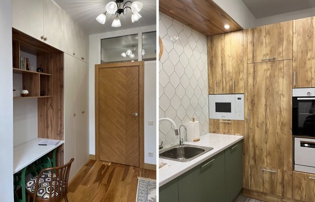 Вдохновляйтесь нашими советами и создайте дом, где всегда есть место для всего Дизайнер Ольга Изотова и ее дочь Анна из однокомнатной квартиры сделали евротрешку. Им удалось оформить уютный и функциональный интерьер и предусмотреть много мест для хранения. Показываем классные решения из проекта — вы можете повторить их в своем интерьере. Барная стойка служит не только для визуального зонирования кухни и гостиной. Это функциональная и удобная система хранения. Со стороны гостиной в ней предусмотрены шкафчики для размещения столовой посуды, со стороны кухни — открытая полка для хлебницы и специй, закрытая секция для продуктов. Одну стену в кухне полностью задействовали под хранение. В нее встроили технику и предусмотрели много хранения — это выкатные системы, выдвижные ящики, полки. Нишу в спальне задействовали для встроенного шкафа. Его фасады имитируют льняную ткань. Одну часть шкафа специально оставили открытой — ее используют как полку для книг. Во второй спальне сделали большой шкаф