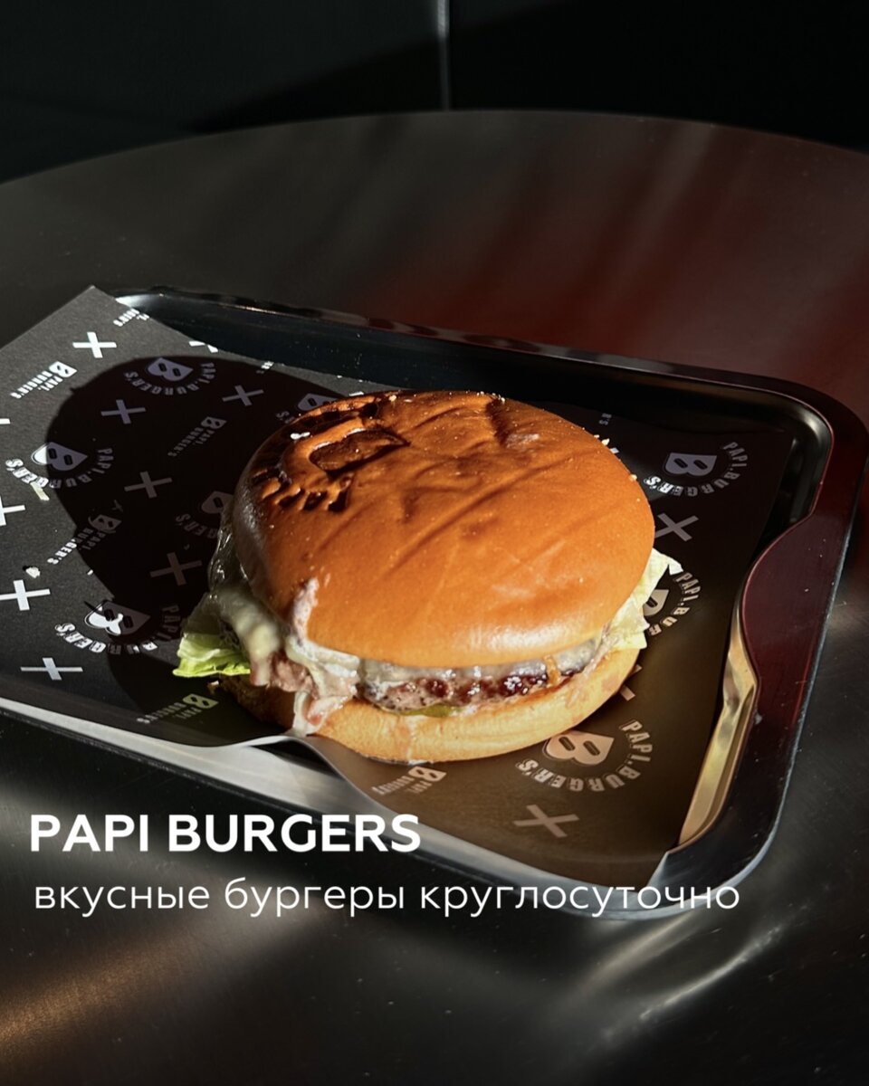 Привет, пупсики! Иногда случаются такие дни, когда для личного здоровья нужно хлопнуть (как говорил один современный классик 😂) хорошенький такой бургер, снимающий напряжение. У меня так точно такое бывает, поэтому время поговорить про открывшуюся зимой бургерную Papi Burgers на Соколова, 68. Небольшое помещение на 6 столов, современный дизайн в темных тонах с расписанными каллиграфией стенами и открытая кухня (при этом вы не прованиваетесь едой на неделю). Понравился стиль, ведь он позволил мне попробовать эксперименты в съемке и монтаже🔥 Очень приятное обслуживание, участливый персонал, отдача быстрая, сбор обратной связи по каждой позиции, ребята участливые и приветливые. В меню: бургеры, снеки. Бар: кофе, чай, газировка, лимонады, соки. Перейдем к традиционному подсчету шекелей! Обозначу сразу общее у всех бургеров: очень нежная булочка бриошь, которая не превращается в жижу со временем (пока снимала, ни одна булочка не пострадала). А еще логотип на самой булочке, меня подку