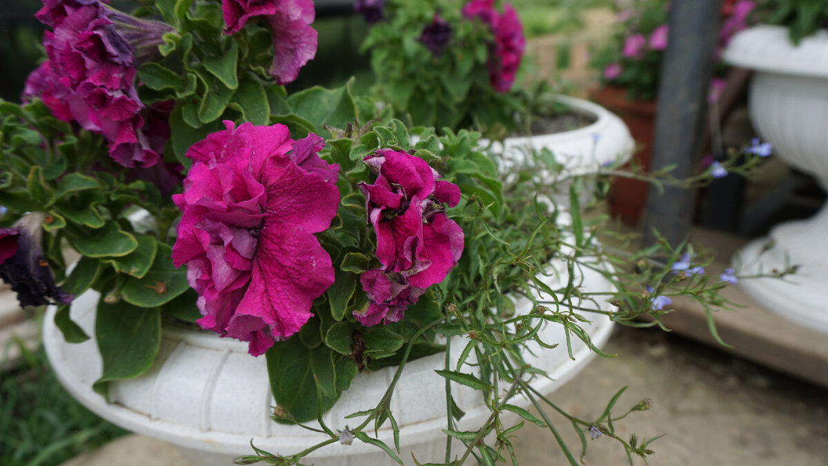В прошлом - 2023 году пришла идея - поставить вазоны вдоль лестницы с пышными цветами. На фото других блогеров петунии растут огромными кустами и я задалась вопросом: "А в чём же секрет?". Спойлер: цели я добилась и пышные кусты цвели на крыльце с мая по октябрь. Делюсь своим опытом. 1 ПРАВИЛО: не покупать рассаду петуний, а выращивать её самим из семян. Да, это трудозатратнее, но только при соблюдении этого первого правила, результат в виде пышного вазона с цветами будет обеспечен. Я не встречала в торговых центрах и на рынках рассады петуний, которая бы смогла сравниться по качеству цветения с моими петуниями. На фото отражён процесс пикировки петуний, в этом году я использовала синтетические мешочки. Главный секрет хорошей рассады - во время активного роста увеличить объем кашпо. По хронологии событий - 1 февраля посеяла семена на рассаду, 20февраля-1 марта (фаза 2-3 настоящих листьев) распикировала, после этого, 1 апреля пересадила петунии в горшки объёмом 1-2 литра. Петуния люби