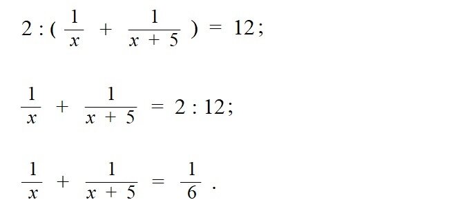 В условии же нашей задачи нет данных о расстоянии от посёлка до станции, поэтому условно берём его за единицу. На дорогу до станции велосипедист потратил 1 : x км/ч, а обратно – 1: (x + 5) км/ч. Поскольку за расстояние от посёлка до станции мы условно взяли единицу, то дорога от посёлка до станции и обратно составляет две единицы, поэтому средняя скорость велосипедиста равна 2 : (1 : x + 1: (x + 5)). Зная, что средняя скорость на всём пути следования составляла 12 км/ч, составляем уравнение: