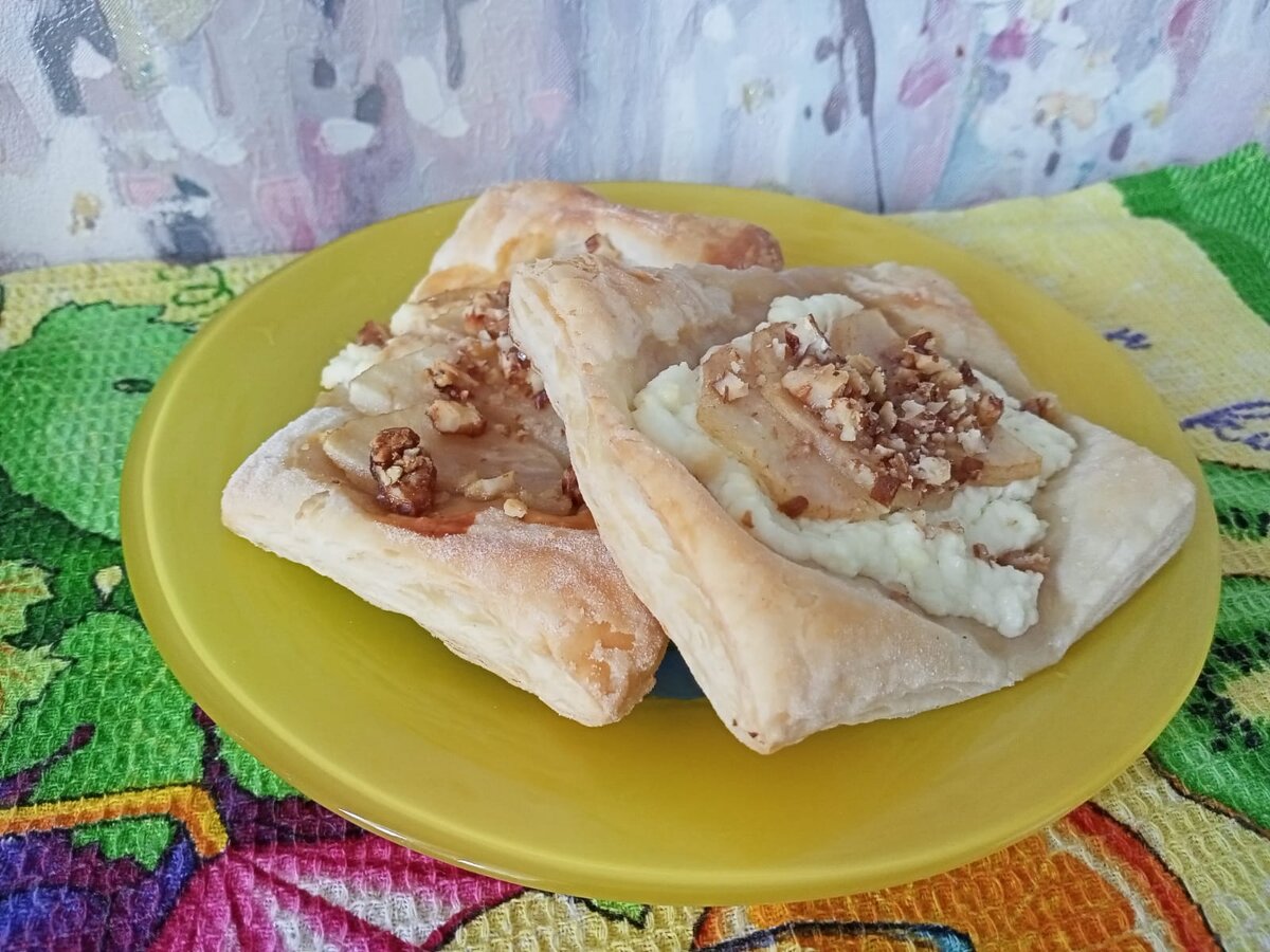 Я давно смотрела на этот рецепт на просторах интернета, но всё никак не могла до него добраться. Но сегодня я его всё-таки приготовила. Единственное Но: нужен по рецепту сыр Камамбер. И тут как всегда: когда он не нужен, он лежит на полках всех супермаркетов, но когда нужен - его нигде нет. Поэтому я его заменила творогом. Кстати, сам сыр Я не пробовала, поэтому не знаю, как всё должно было получиться на вкус. Итак, для приготовления нам необходимы следующие продукты: - Тесто слоёное бездрожжевое. - Творог, 1 брикет 5%-ы й. - Сахарный песок. - Груша Конференция, 1 штука. - Мёд. - Орехи грецкие. Творог разминаем, добавляем сахар, перемешиваем. Много сахара не нужно, так как у нас мёд и сладкие груши. Слегка раскатываем тесто. Разрезаем на прямоугольники, выкладываем на противень, застеленный бумагой для выпекания (у меня бумаги не было, поэтому я застелила фольгой). На кусочки теста раскладываем творог, кусочки груши, чуточку мёда и сверху измельчённые грецкие орехи.