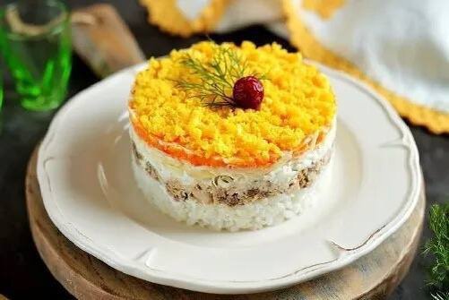 Всем доброго времени суток! В этой статье хочу поделиться с вами рецептом моего любимого салата. Уже не раз готовлю его по именно этому рецепту. Итак, начнём. Салат «Мимоза» 📖 Ингредиенты: - Консервированная рыба в масле – 1 банка - Отварной картофель – 2 шт. - Отварная морковь – 2 шт. - Яйца вкрутую – 5 шт. - Твёрдый сыр – 150 г. - Лук – 2 шт. - Майонез. (соль - по вкусу). 🧑🏻🍳 Приготовление: 1. Для начала варим яйца. Отделите белки от желтков, и натрите белки на мелкой терке. После этого равномерно выложите их в глубокую тарелку – это и будет первым слоем салата. Смажьте его майонезом. 2. Далее натрите на тёрке сыр, выложите его на белки – 2й слой. Затем – майонез. 3. Третьим слоем будет рыба, которую нужно предварительно размять вилкой. Не забывайте про майонезную прослойку. После этого пришла очередь нарезанного и ошпаренного (чтобы не горчил) лука. Затем – слой майонеза. 4. Натрите картофель, после чего уложите его следующим слоем. На картофель положите оставшуюся рыбу,