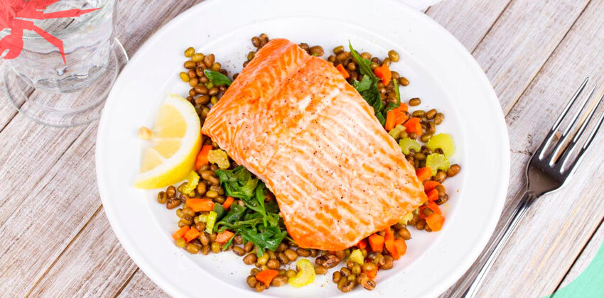 Ингредиенты: Для начала замачиваем чечевицу на 2 часа. Затем промываем ее. Берем глубокую сковороду, разогреваем половину масла. Нарезаем морковь и сельдерей небольшими кусочками. Обжариваем до мягкости. Выкладываем на сковороду чечевицу. Солим и перчим. Заливаем 750 мл воды. Доводим до кипения и готовим на слабом огне 40 минут. Затем разогреваем духовку до 200 градусов. Застилаем противень фольгой. Разрезаем рыбу на 4 кусочка, кладем на противень. Солим, перчим и сбрызгиваем оставшимся маслом. Запекаем филе около 10 минут. Подаем с чечевицей и руколой. Источник: https://wildcrab.ru/news?id=2414