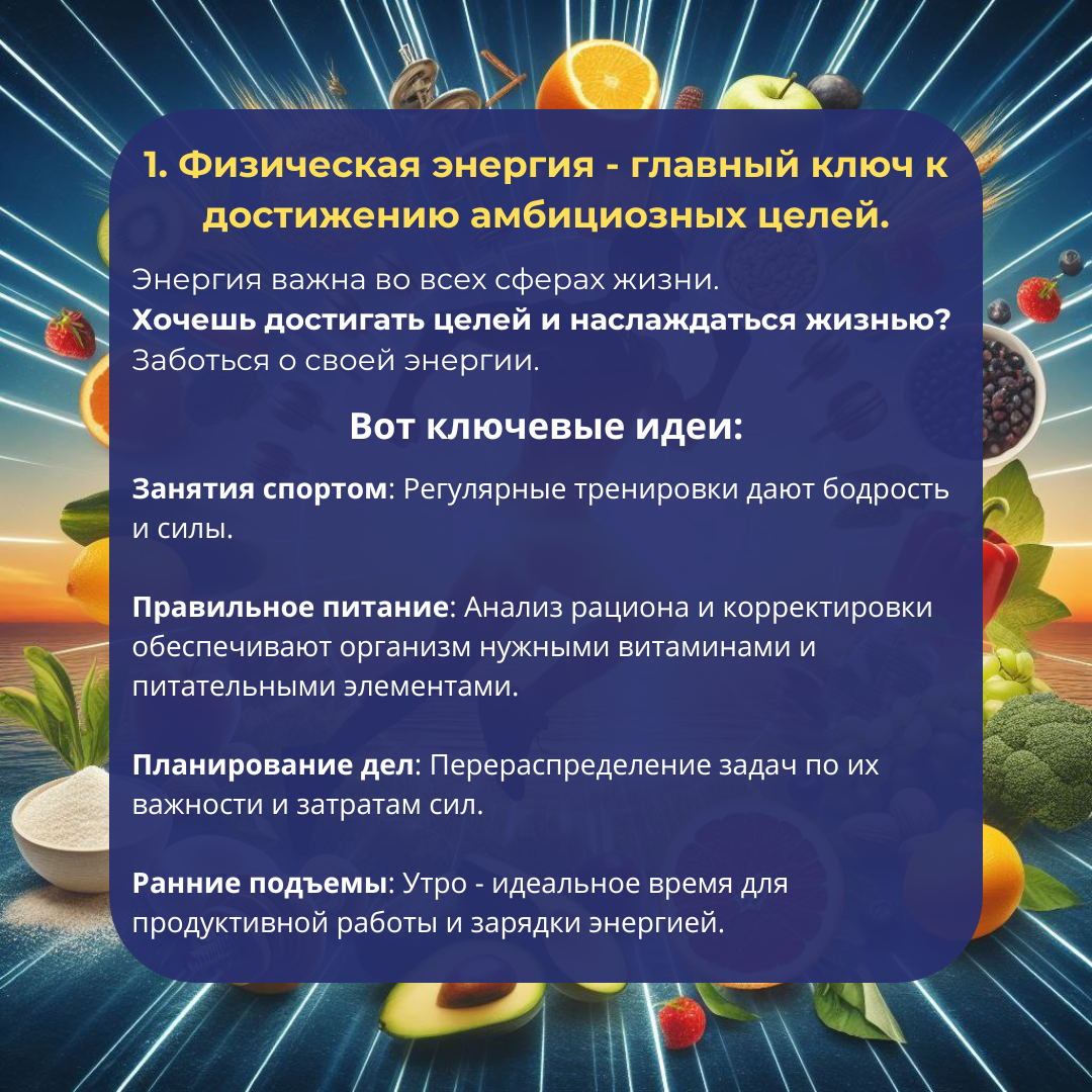 Большой запас физической энергии - пожалуй одно из самых важных качеств, для достижения амбициозных целей. Успешные люди всегда подчеркивают важность физической энергии, так как вялые люди не могут зажечь не себя, не других людей. Думаю вы тоже от многих успешных людей видите подобные слова насчет важности энергии, для успеха и я с ними полностью согласен! Только за последние несколько дней в ленте увидел вот такие мнения: Мария Полуянова, маркетинг-гуру с 70 000 подписчиков: "Нет энергии - нет продаж. Когда работаешь на себя, нужно очень внимательно следить за состоянием, ведь любой упадок сил моментально скажется на доходах". Михаил Гребенюк, культовый бизнес-тренер превзошедший своих учителей с БМ: "Не бывает миллиардеров без запаса энергии. Состояние - фундамент всего". Конечно это касается не только бизнеса, но и любой сферы жизни. Хочешь достигать целей, кайфовать от жизни и быть "богатеньким Буратино" не только на словах? Тогда первое, о чем нужно позаботиться – это твоя энергия