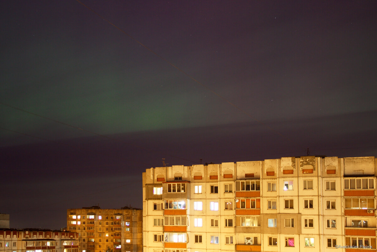 Ближе к концу длинных майских выходных две ночи подряд небо загоралось северным светом в довольно низких, нетипичных для себя широтах. У меня есть специальное приложение, которое присылает мне уведомления, когда появляется вероятность сияния. Поэтому я достаточно много ночей провела дежуря у окна с фотоаппаратом, ведь когда оно достаточно яркое, городская засветка ему не помеха.