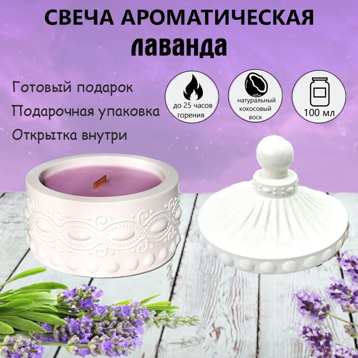 У нас в продаже появилась новая свечка из натурального кокосового воска в гипсовом подсвечнике с ароматом лаванды .